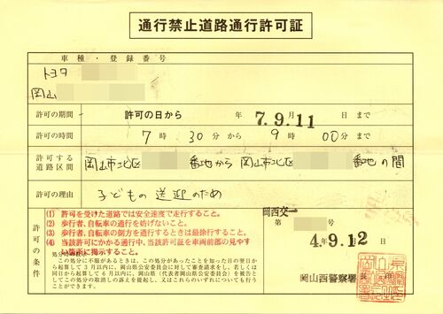 学校の周りの道路って、「スクールゾーン」になっていて、時間帯で通行禁止になっていますよね。子どもを車で送迎するときに必要な「通行禁止道路通行許可証」の申請について紹介しています。